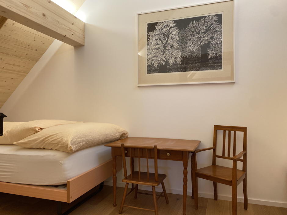 Das grosse Familienzimmer liegt im Dachgeschoss und hat ein grosses Bad mit WC & Dusche. Es ist mit einem Doppelbett, einem Tisch mit vier Stühlen und einem TV ausgestattet. Das separate Kinderzimmer ist über eine kleine Treppe zu erreichen und bietet zwei normalgrosse Betten. Das Sofa kann als fünftes Bett bereitgestellt werden.