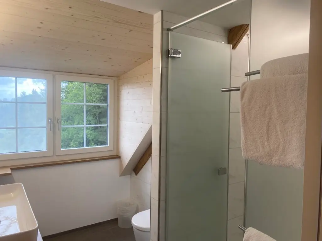 Die beiden grosszügigen Superior Doppelzimmer haben einen Balkon mit Sicht über die Appenzeller Hügellandschaft und ein eigenes Bad mit WC & Dusche. Es ist mit einem Doppelbett, einem grossen Tisch mit zwei bequemen Stühlen, einem Schrank, einer grosszügigen Sitzbank und einem Smart-TV augestattet. Auf dem Balkon finden sich ein Tischchen mit zwei Stühlen. Kissen liegen bereit.